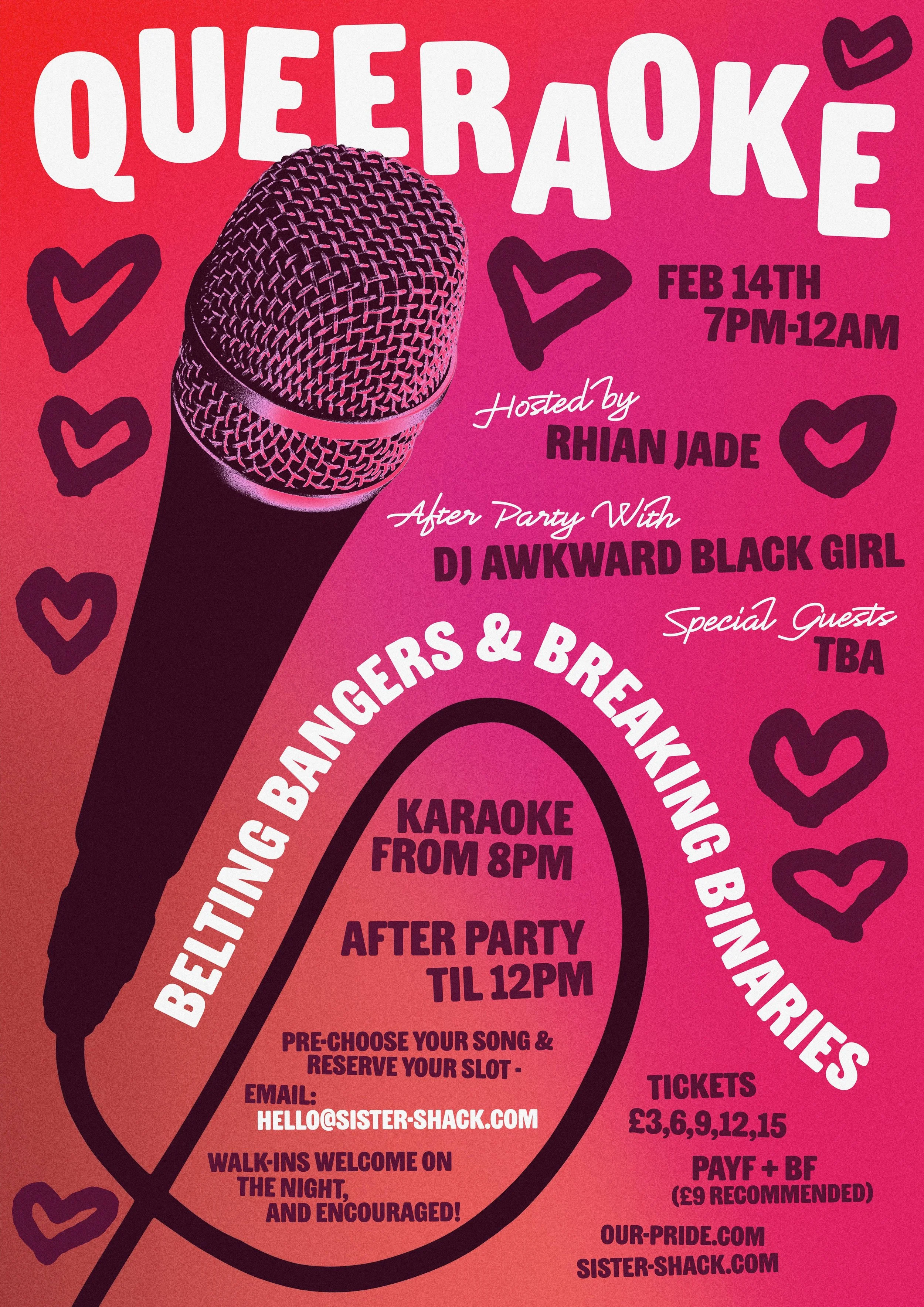 Hosted by Rhian Jade, Queeraoke is all about good songs, a relaxed and friendly vibe, and no pressure to be perfect. Sing, watch, or just hang out. Special guests TBA